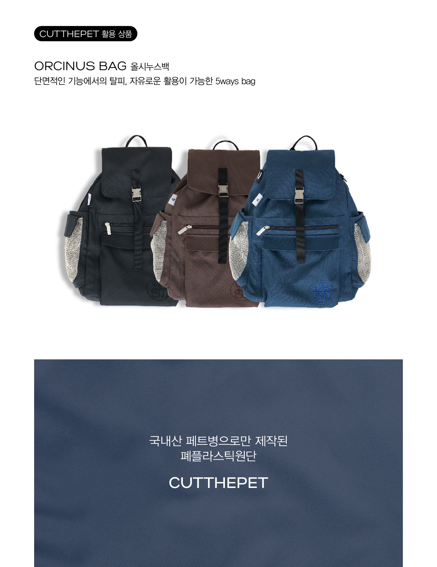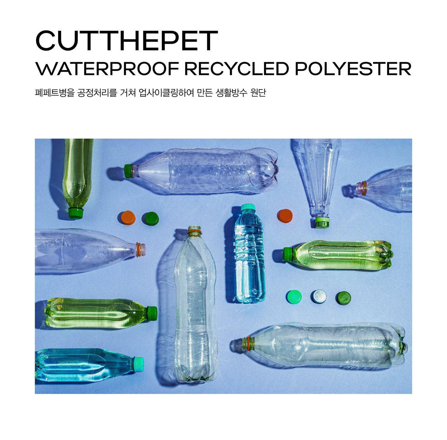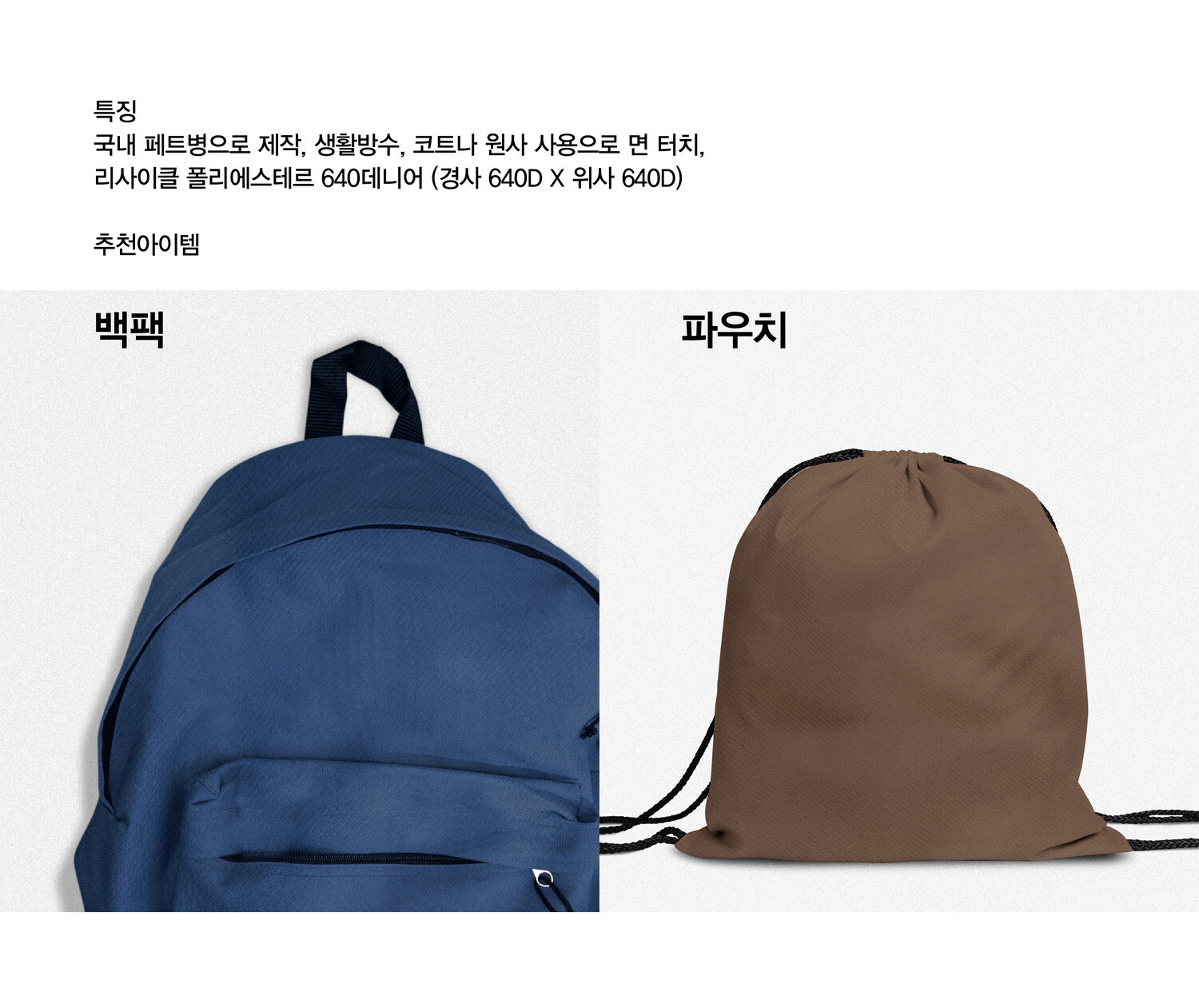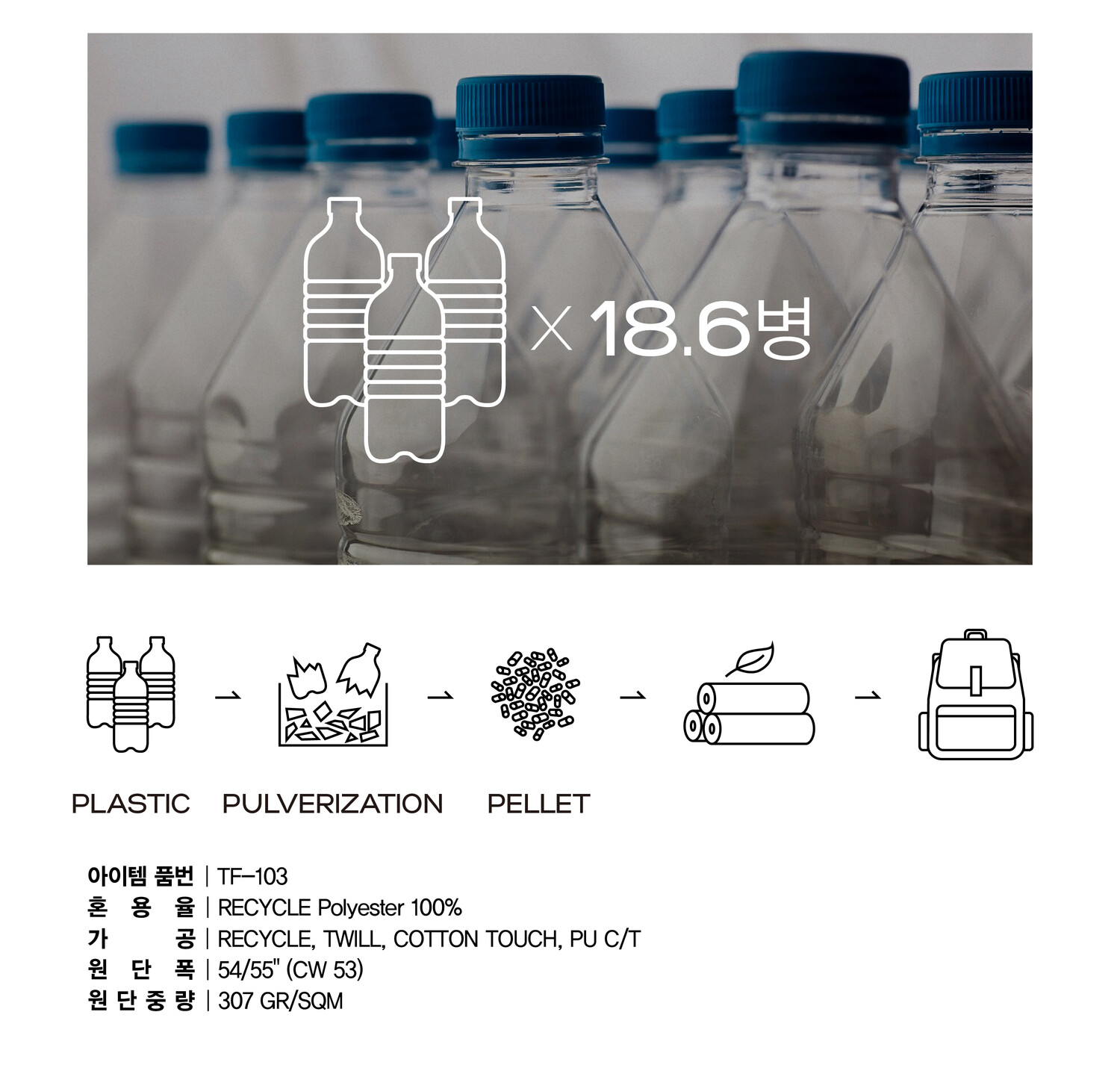 특징 : 국내 페트병으로 제작, 생활방수, 코트나 원사 사용으로 면 터치,리사이클 폴리에스테르 640데니어 (경사 640D X 위사 640D)